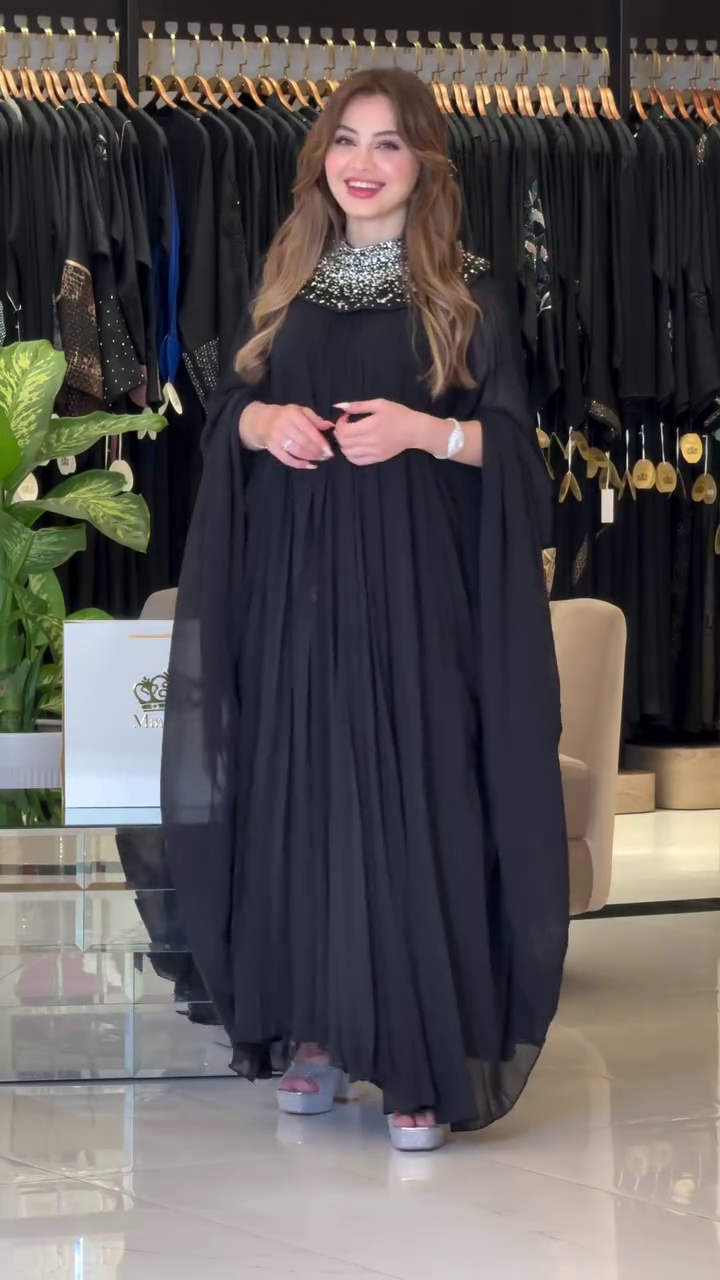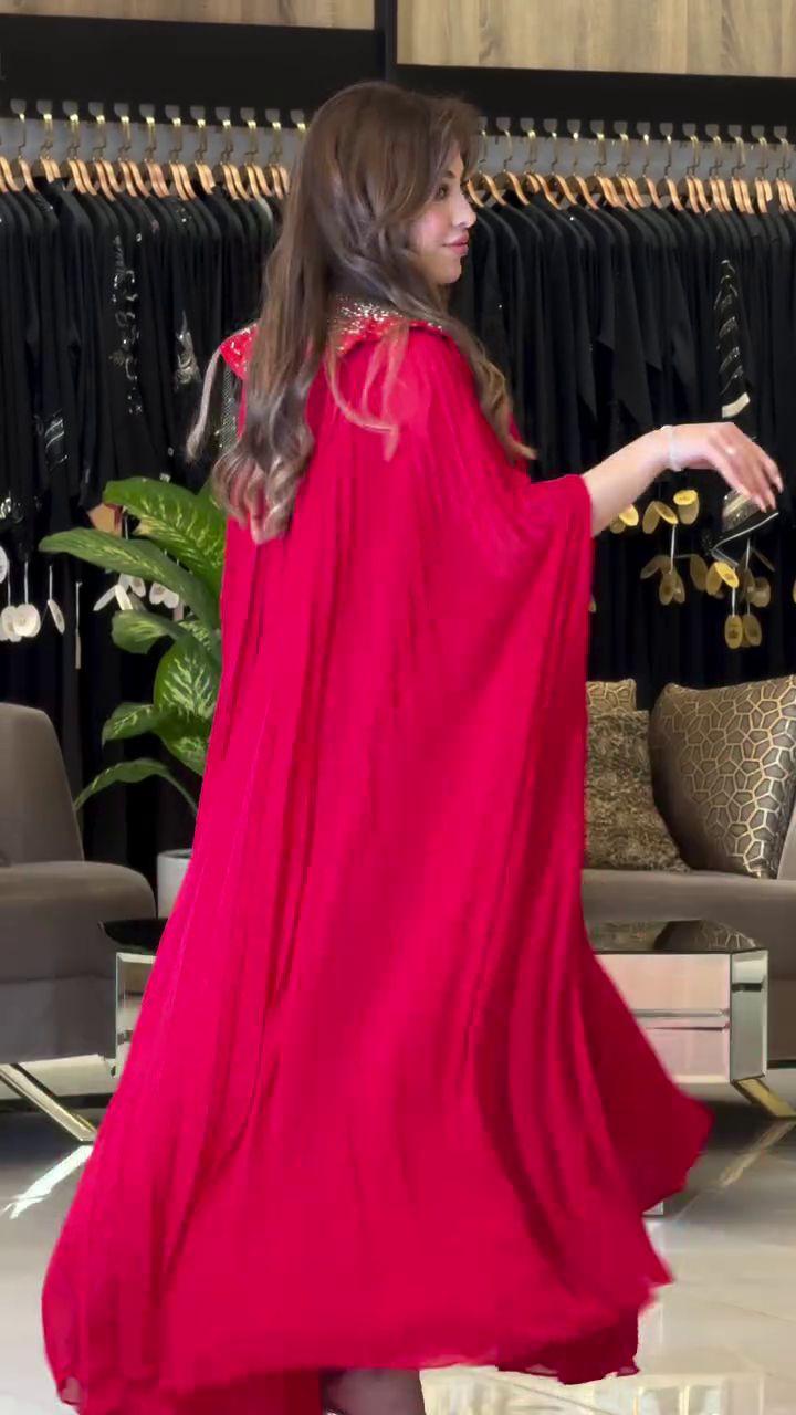 Make a statement with our stunning chiffon evening gown, featuring a flowy kaftan-style silhouette and elegant cape sleeves. Designed for sophistication and grace, this dress is perfect for evening parties, weddings, formal events, and special occasions.