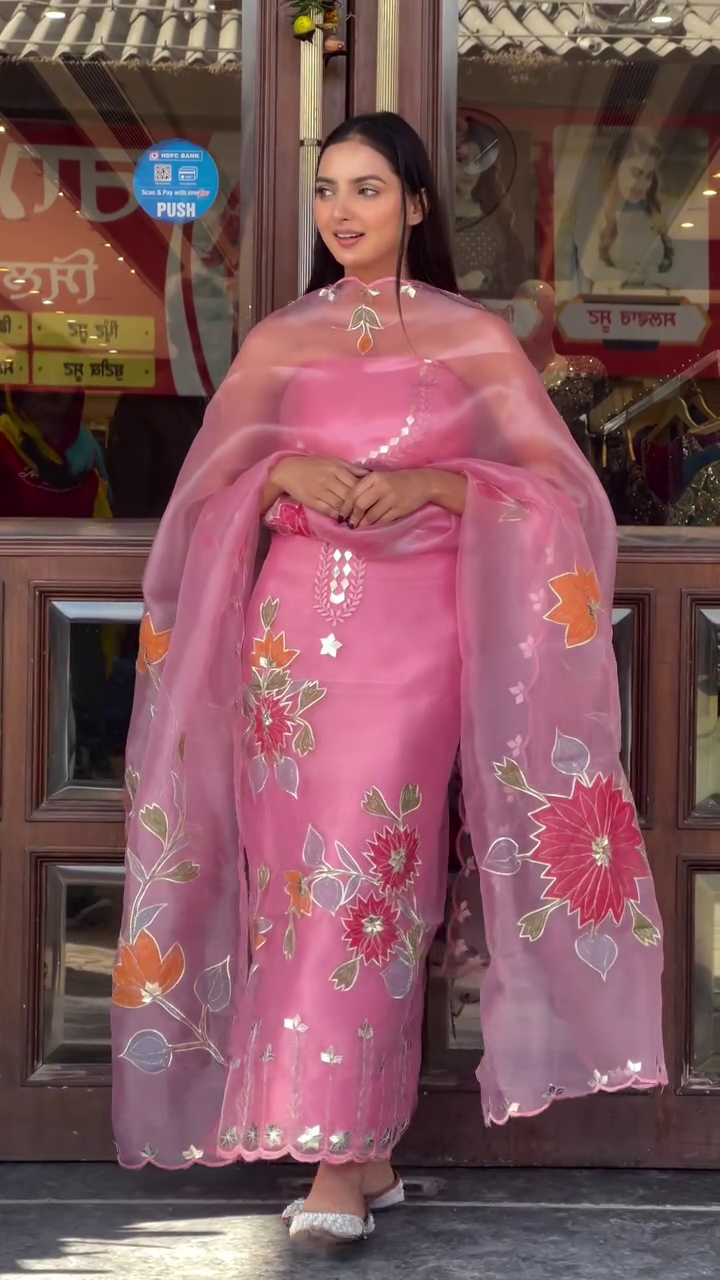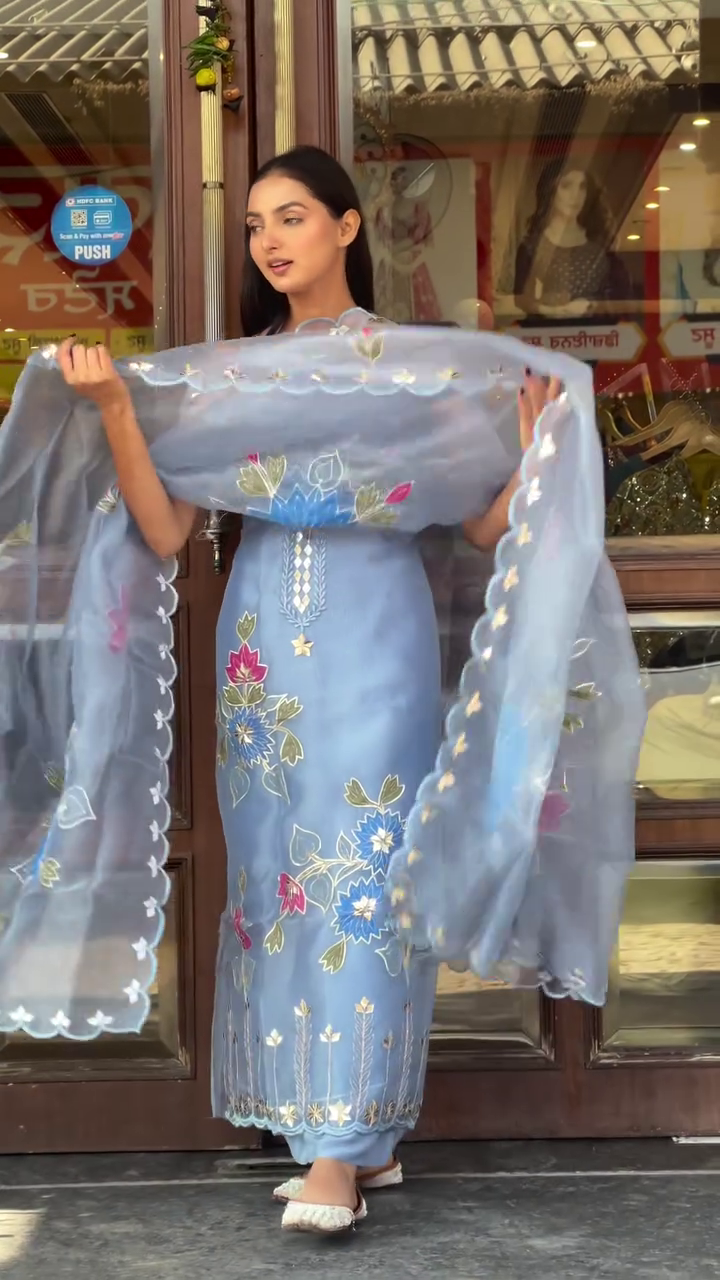 The Unstitched Organza Salwar Suit Material with Embroidery sounds like a luxurious fabric option for crafting a custom salwar suit. Organza is known for its lightweight, sheer texture, which adds an elegant and airy feel to the outfit. Here’s a breakdown of what this unstitched material might entail: