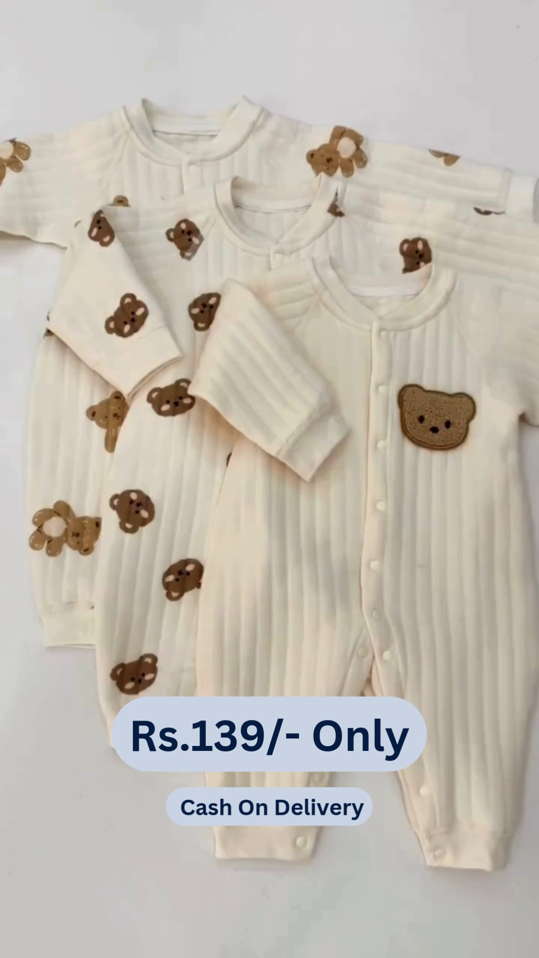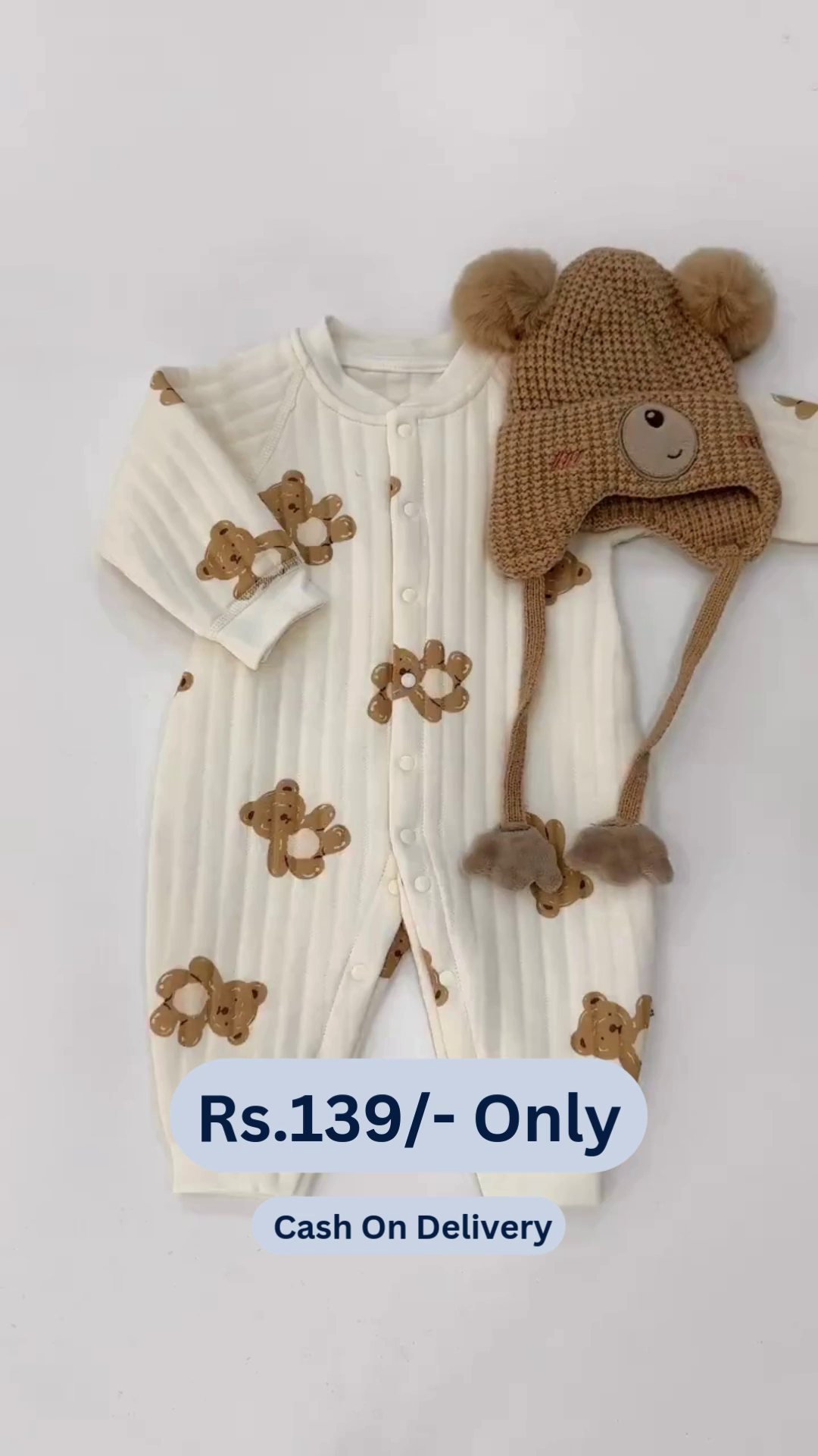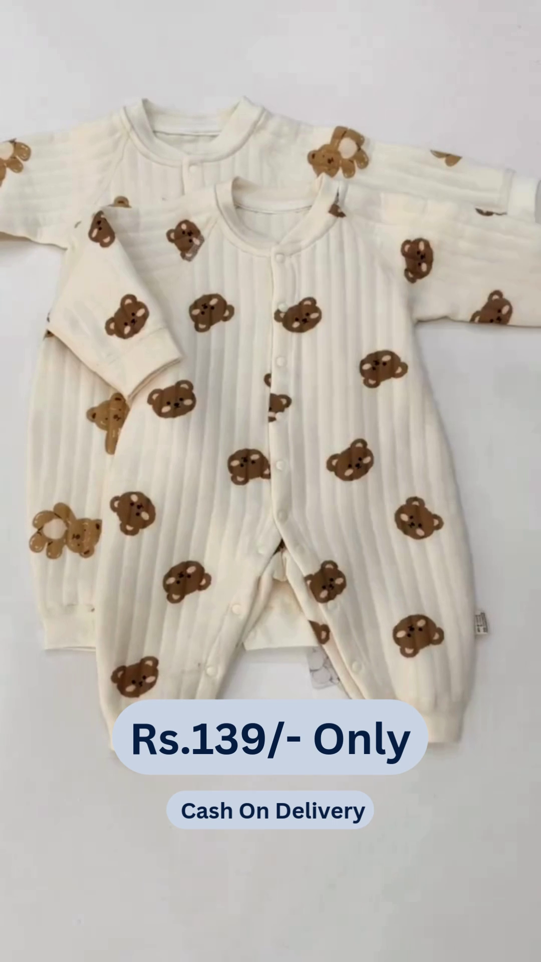 A Cute Teddy Print Full Sleeves Full Length Romper for newborns and infants in brown and white would be an adorable and cozy outfit choice. Here’s a description:
