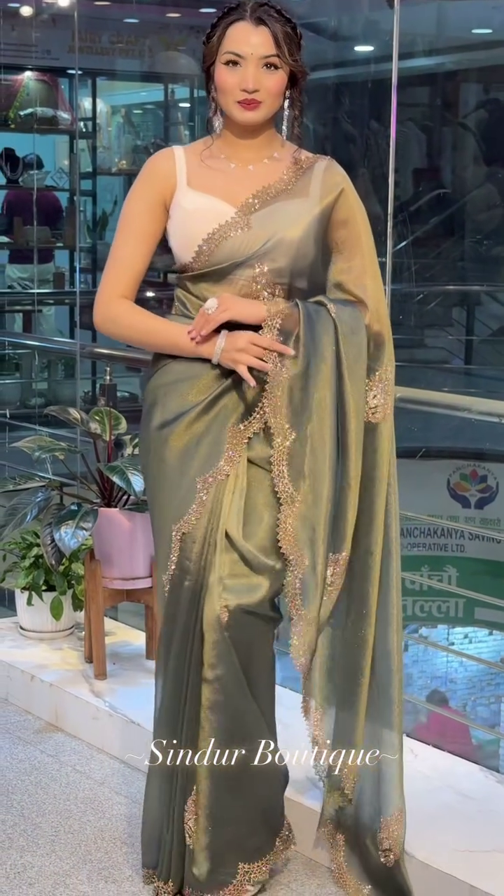 Drape yourself in elegance with this luxurious Two-Tone Grey Golden Saree crafted from Soft Chiffon Tissue. Featuring a rich Diamond Crystal Work Panel, this saree radiates grace and glamour—ideal for weddings, receptions, or evening festivities.
